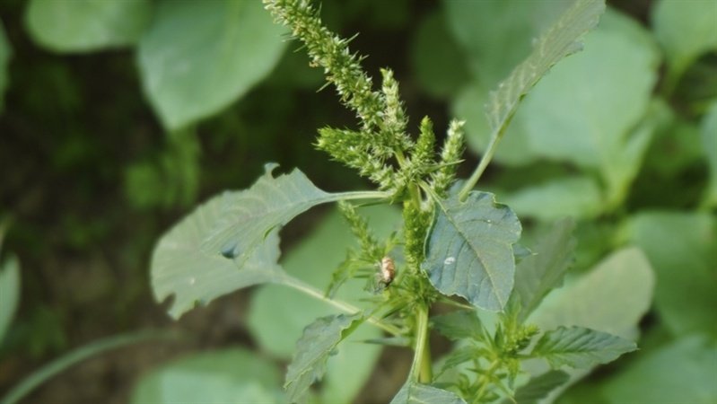 - Fique atento aos sinais: Folhas ovadas com marcas em V, inflorescências densas e caules espessos são indícios de Amaranthus palmeri.
