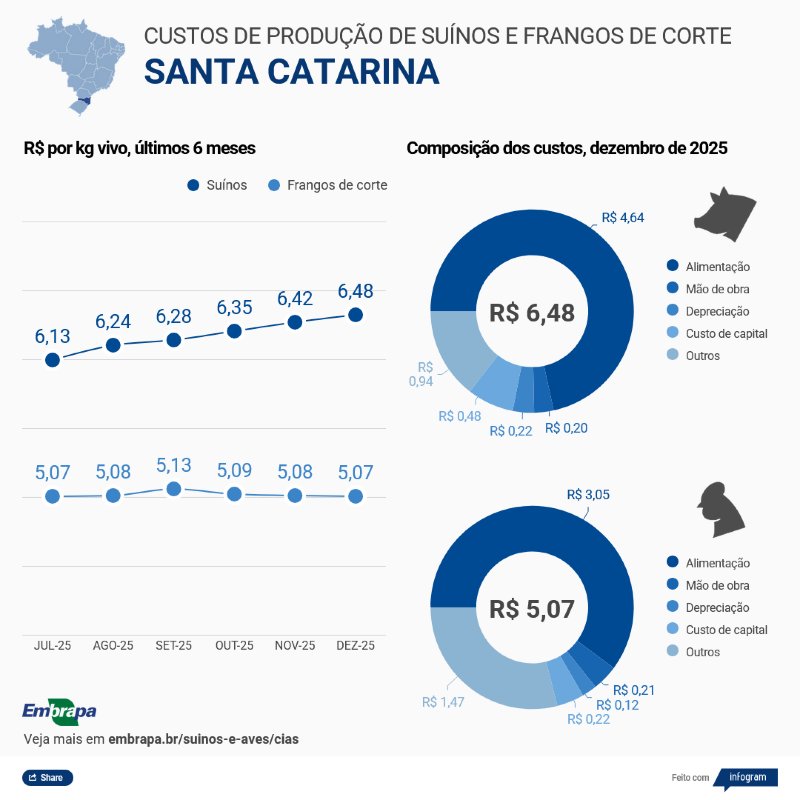 Em Santa Catarina, o custo de produção do quilo do suíno vivo foi de R$ 6,48 em dezembro, alta de 0,99% em relação ao mês anterior, com o ICPSuíno chegando aos 370,68 pontos. O índice encerrou o ano registrando aumento de 4,39% em 2025. A ração, responsável por 71,67% do custo total de produção em dezembro, subiu 1,71% no mês e 1,82% no ano.