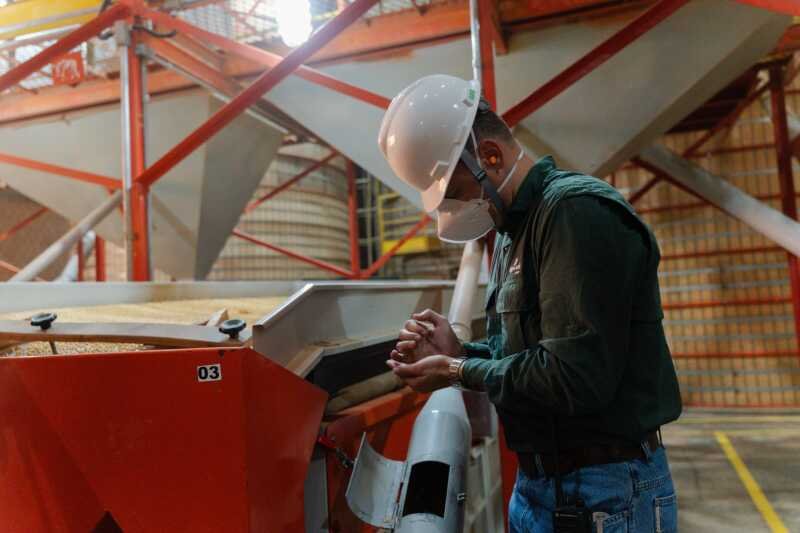 Com a chegada da carga na empresa, é feita a etapa de pré-limpeza, que elimina impurezas maiores e menores, como restos vegetais e grãos fora de padrão. Na sequência, a semente é direcionada a silos específicos para semente, equipados com sistemas de aeração, onde permanece até seguir para a secagem controlada, que reduz a umidade para níveis ideais, em torno de 12% a 12,5%.