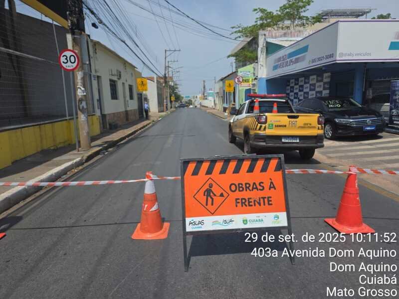 A Prefeitura de Cuiabá acompanha, nesta segunda-feira (29), os trabalhos de reparo em uma rede de abastecimento de água na Avenida Dom Aquino, realizados pela concessionária Águas Cuiabá. O serviço é executado nas proximidades do Hospital H-Bento, no sentido bairro Porto, e exige a interdição total de um trecho da via.