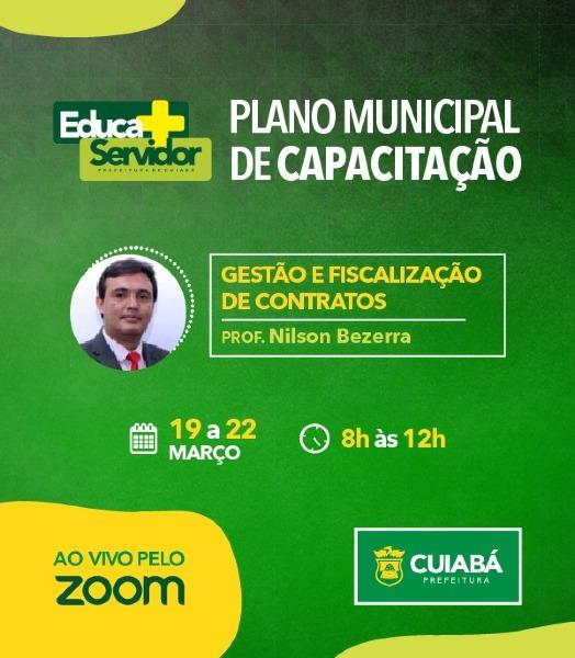O curso de Gestão e Fiscalização de Contratos será realizado entre os dias 19 e 22 de março pelo professor Nilson Bezerra. O curso será realizado no período matutino, das 8h às 12h. O oferecimento dos dois curso faz parte do Plano Municipal de Capacitação.