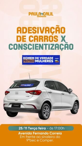 A presidente da Câmara Municipal de Cuiabá, vereadora Paula Calil (PL), realizará nesta terça-feira (25), a partir das 17h, uma ação de adesivação de veículos na Avenida Fernando Corrêa da Costa, em frente ao semáforo do 9º BEC.