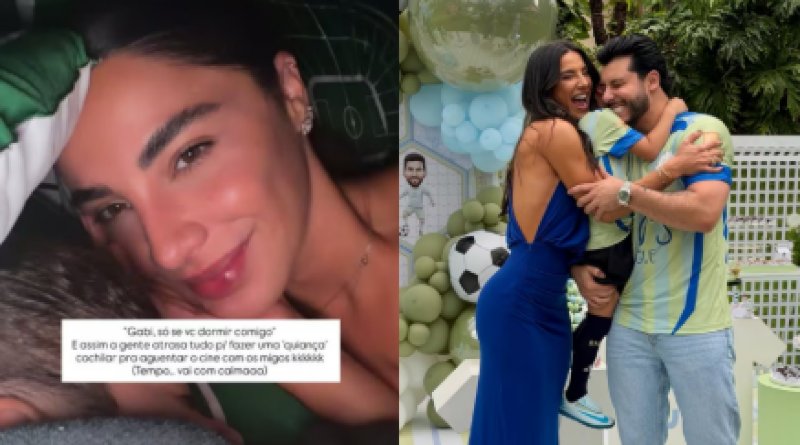 Em um story no Instagram, Gabriela contou que o menino fez um pedido especial: “Gabi, só se vc dormir comigo”. Com bom humor, ela explicou: “E assim a gente atrasa tudo pra fazer uma ‘quiança’ cochilar pra aguentar o cine com os migos kkkkk”. Logo depois, completou de forma carinhosa: “(Tempo… vai com calmaaa)”.