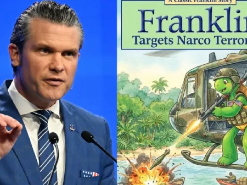 A montagem compartilhada por Hegseth mostra uma tartaruga verde chamada Charlie, de um desenho infantil de mais de 20 anos de existência e popular nos EUA, a bordo de um helicóptero disparando um lança-mísseis contra barcos carregados com pacotes e pessoas armadas com o título "Franklin mira narcoterroristas".