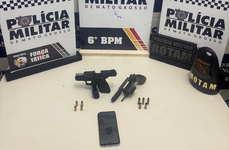 A polícia apreendeu no local com os suspeitos, uma pistola 9mm (uso restrito) com munições, um revólver calibre .38 com munições deflagradas e picotadas, além do veículo C3 branco e um celular.