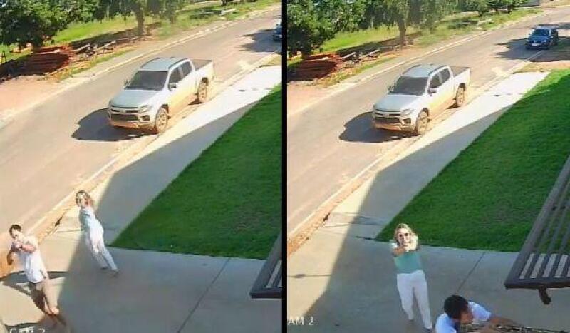 A ação dura cerca de dois minutos. Antes de deixar a casa, ela atira contra uma câmera de segurança, mas sem sucesso, A mulher, então, pede ao filho, Bruno, mas ele também não consegue atingir o equipamento.