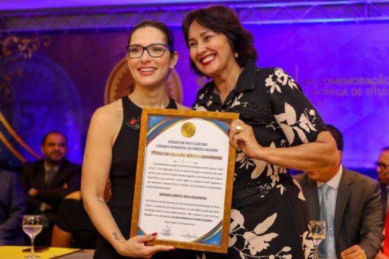A deputada estadual Janaina Riva (MDB), recebeu na noite da última sexta-feira (10.05), o título de cidadã várzea-grandense, durante solenidade da Câmara Municipal de Várzea Grande, ocorrida no Mirante das Águas.