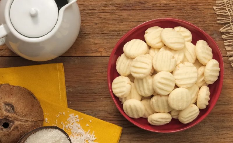 - 1Em um recipiente, coloque 2 xícaras de chá de amido de milho, 5 colheres de sopa de farinha de trigo, 5 colheres de sopa de açúcar, 3 colheres de sopa de coco ralado e 150 gramas de manteiga. Misture bem com as mãos.