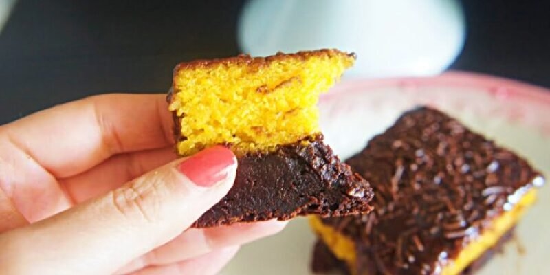 Unte uma forma média. Despeje a massa de bolo de cenoura primeiro. Por cima, espalhe a massa de brownie com cuidado, sem misturar.
