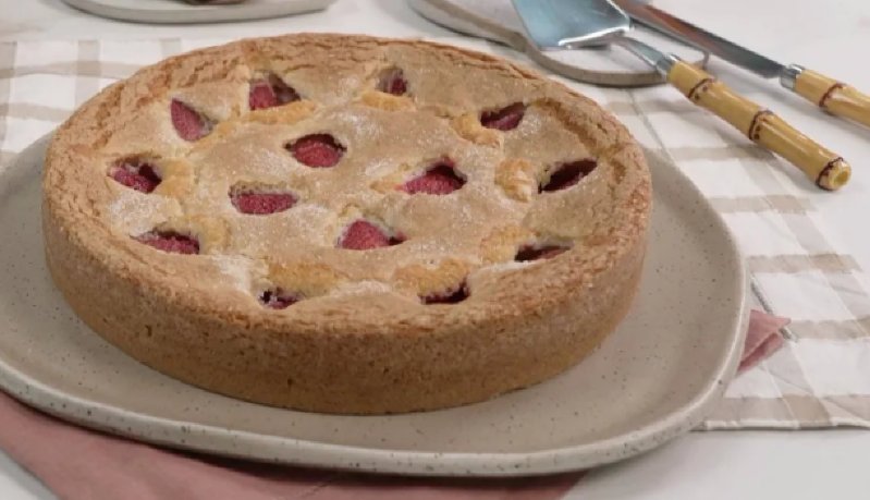 - 4Coloque a massa em uma forma untada e adicione os morangos cortados por toda a massa.