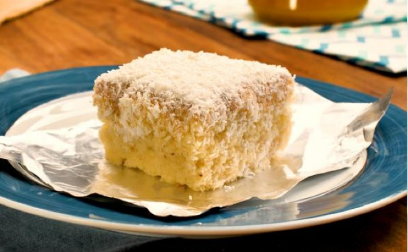 8 - Com o bolo ainda quente, despeje a cobertura sobre ele e salpique por cima o coco ralado.