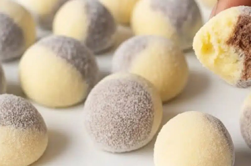 - Pegue um pouquinho da massa branca e um pouquinho da massa de chocolate, enrole com as mãos boleando bem e empane-os no leite em pó.