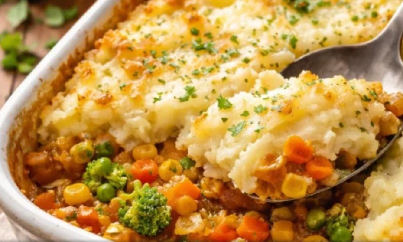 - Monte o escondidinho: em um refratário, coloque metade do purê, espalhe o recheio por cima e cubra com o restante do purê.