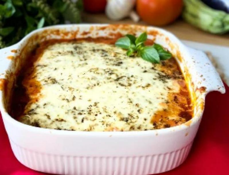 - Em uma assadeira, faça camadas intercaladas de molho de tomate, berinjela, abobrinha e fatias de queijo meia cura. Faça essas camadas até finalizar os ingredientes;