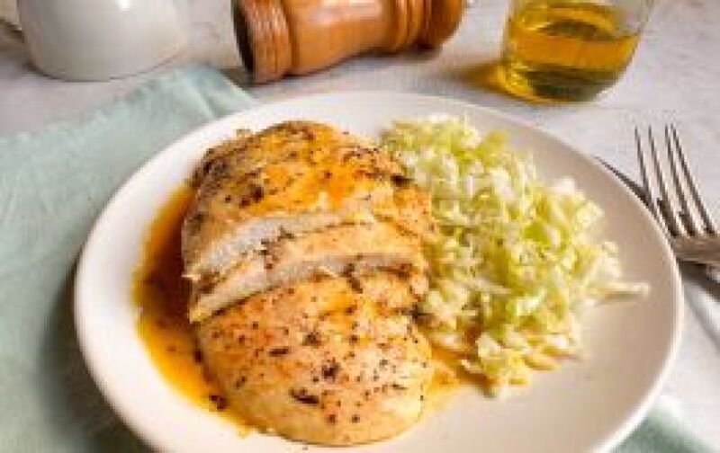 Coloque os bifes de frango com o lado temperado virado para baixo. Mexa apenas a frigideira, não os bifes, para evitar que grudem;