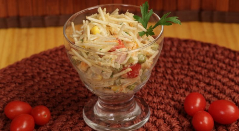 4 - Arrume a mistura em uma travessa e na hora de servir, coloque a batata palha por cima.