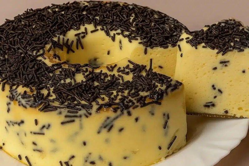 Despeje essa mistura em uma forma redonda com furo central untada com óleo e chocolate granulado.