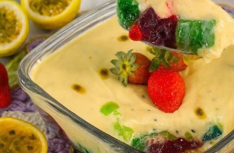 - Desligue o fogo, transfira para um prato e quando amornar coloque colheradas desse suco de maracujá que foi reduzido e misture mais uma vez.