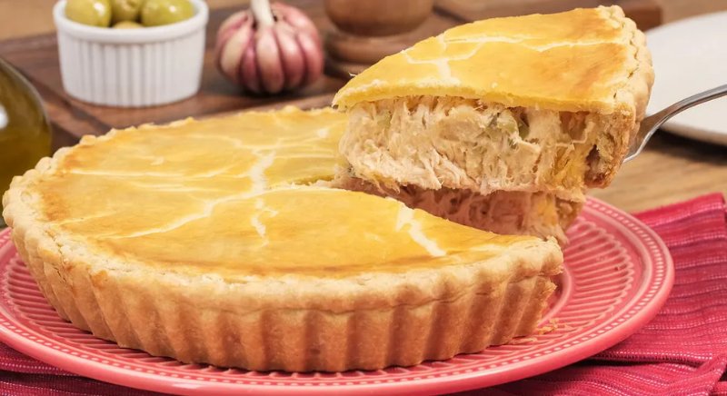 - 4Coloque metade da massa em uma forma redonda, espalhe o recheio de frango e cubra com o restante da massa. Retire os excessos de massa.